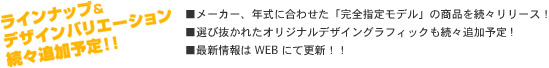 COBOO-G KITとは、COBOO STUDIOが独自に製作したデザイン性に優れたボディデカールキットです。 特定のモデル専用なので、ガイドに沿って作業すれば簡単、あなたの愛車も気軽にドレスアップ! バリエーションに富んだデザインの中から、お気に入りのデザインを選んでSTREETを走れば注目の的 間違いなしです!!